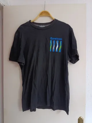Camiseta de manga corta con un diseño gráfico en el pecho. - Logo de Reebok. - Diseño con líneas verticales en azul, blanco y verde.