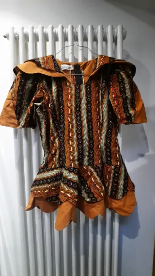 Camisa artesanal con un vibrante estampado africano. Su diseño único la hace destacar. - Mangas cortas. - Cuello con solapa. - Bajo con corte festoneado.