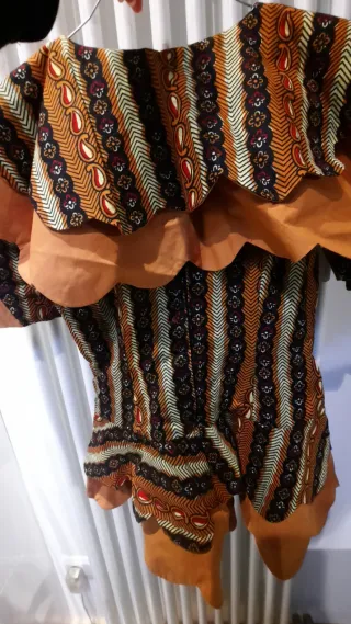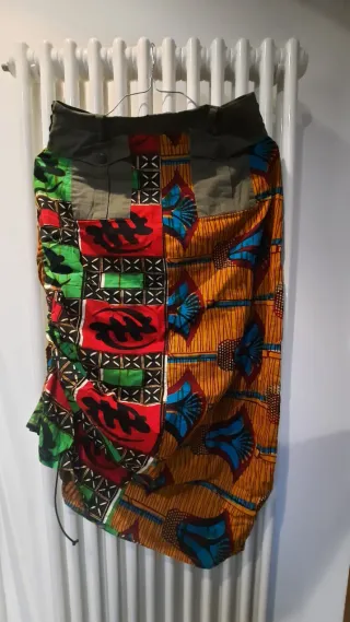 Falda única con un diseño patchwork vibrante y llamativo. - Confección artesanal. - Combinación de estampados geométricos y florales. - Detalle de fruncido lateral. - Cordón ajustable en el bajo.