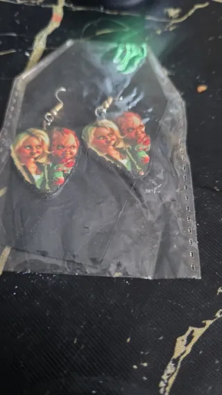 Pendientes con diseño de Chucky.y Tiffany - Diseño de personaje. - Cierre de anzuelo.