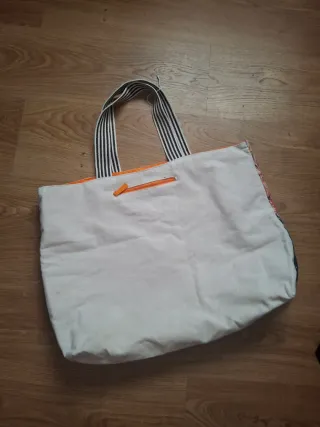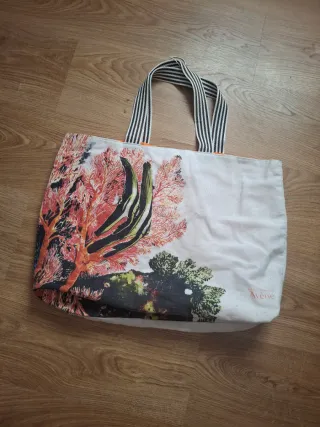 Bolsa de tela con un diseño vibrante y original. - Estampado de coral y elementos marinos. - Asas de rayas blancas y negras. - Interior con detalles naranjas.