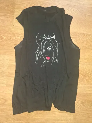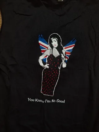 Camiseta sin mangas con un diseño gráfico llamativo. Presenta una figura Amy con alas inspiradas en la Union Jack y el texto You Know I'm No Good. - Diseño de figura Amy con alas. - Estampado de lunares rojos sobre fondo negro en el vestido. - Texto You Know I'm No Good en la parte inferior.