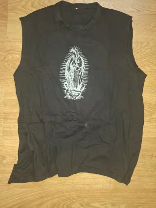 Camiseta sin mangas con un diseño de la Virgen de Guadalupe. - Estampado blanco sobre fondo negro. - Diseño detallado de la figura religiosa.