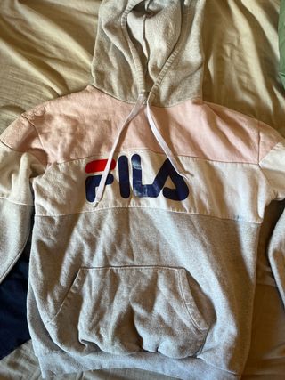 Sudadera con capucha de la marca Fila. - Diseño color block con paneles grises y rosas. - Logo de Fila en el pecho. - Bolsillo tipo canguro delantero. - Cordones blancos para ajustar la capucha.