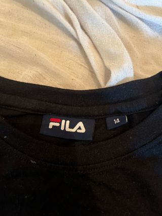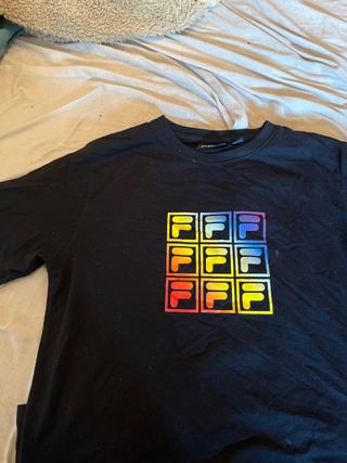 Camiseta negra de la marca Fila con un diseño llamativo en el pecho. - Múltiples logos de Fila dispuestos en una cuadrícula. - Logos con degradado de colores arcoíris. -Talla 14