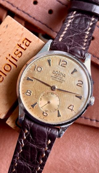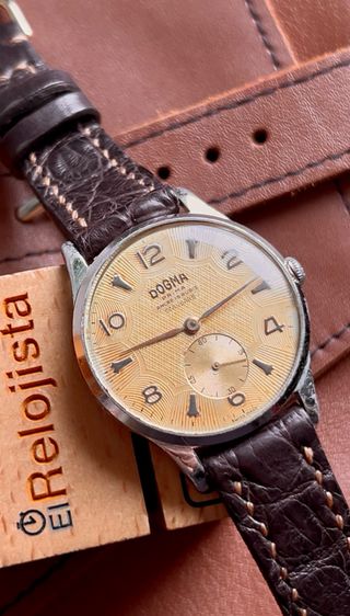 Reloj suizo DOGMA mecánico de los años 50, calibre AS1130 totalmente original, esfera original con una preciosa pátina tropical. Tamaño gigante para la época, con diámetro de 38mm sin incluir corona. Mecanismo de cuerda manual con 15 rubíes. Correa artesana de piel natural de cocodrilo marrón de 20mm. Más información en las imágenes. Esfera Guilloche en relieve con diseño en forma de estrella. Cristal plexi en buen estado. Más relojes en mi perfil !!!! 👀 Envío certificado con numero de seguimiento. No se incluyen caja ni documentos. No se admiten devoluciones Ref. Cauny Certina Duward Dogma Seiko Tissot Omega Orient Eterna Cyma