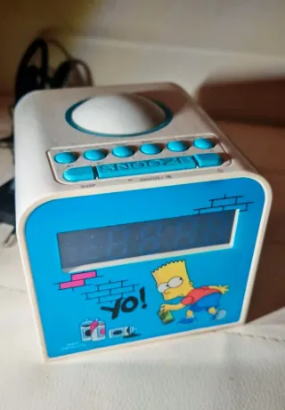 Despertador con diseño de Los Simpsons, personaje Bart. - Parte frontal con ilustración de Bart Simpson. - Botones de control en la parte superior. - Pantalla digital.