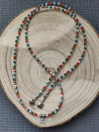 Elegante collar maxi adornado con piedras de cristal en tonos multicolor. Un accesorio llamativo y versátil. - Hecho a mano. - Diseño con múltiples cuentas de cristal facetado. - Incluye dos dijes en forma de corazón y un dije con la letra 'A'. - Varias posiciones.