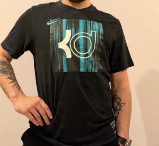 Camiseta deportiva Nike con un diseño llamativo. - Estampado frontal con el logo KD. - Detalles en color turquesa y negro.