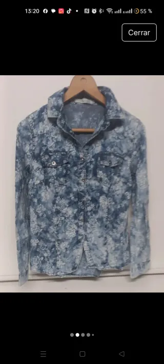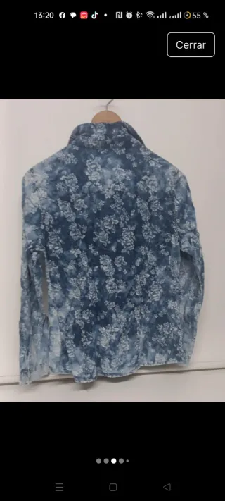 Camisa de estilo denim con un estampado floral en tonos azules y blancos. Es una prenda versátil que aporta un toque único a cualquier atuendo. - Diseño de corte clásico con botones. - Dos bolsillos en la parte frontal. - Mangas largas. medidas: Espalda 39, contorno de pecho hasta 96, largo 64, algodon, NO elastano, nueva sin 🏷️🌸🌸🌸