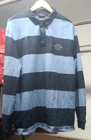 Polo de manga larga con un diseño de rayas horizontales. - Cuello tipo polo con botones. - Tejido de algodón. - Estampado de Quality Crafted Goods en el pecho. De la afamada marca C&A talla XL,Medidas: Espalda 47, Contorno de pecho hasta 122, largo 78, excelente 🍀