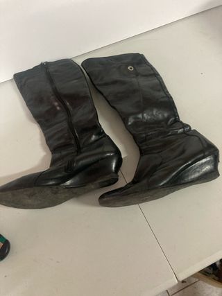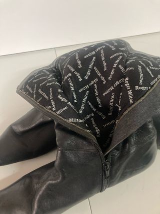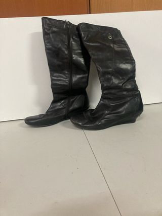 Botas altas de cuero negro con suela plana. - Cierre de cremallera lateral. - Diseño moderno y versátil. - Detalle metálico en la parte superior.