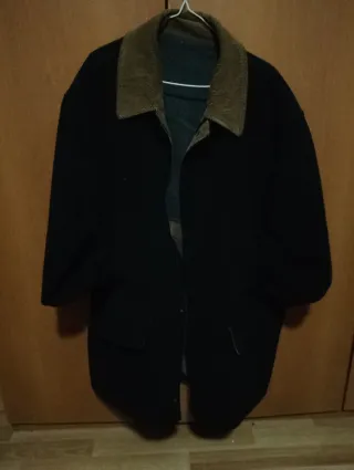 Abrigo de lana con cuello de pana. - Color principal negro. - Cuello en tono marrón.