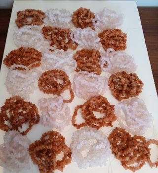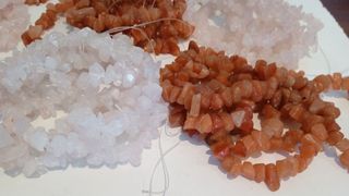 Lote de 24 tiras de chips de piedra natural, cada una de 85 cm de largo. Son ideales para bisutería y manualidades. Hay cuarzo rosa y Carneola marron - Piedras en tonos naranja y blanco. - Longitud de cada tira: 85 cm. - Cantidad: 24 tiras.