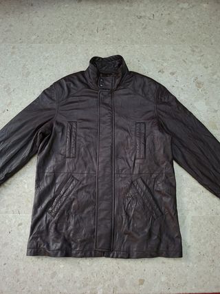 Elegante chaqueta de cuero marrón de corte recto y estilo atemporal. Piel genuina de alta calidad, muy cómoda y con interior forrado. Ideal para entretiempo o invierno. Cierre de botones (todos originales). Bolsillos laterales y frontal con botón. Hombros: 59cm | Mangas: 58,5cm | Largo: 71,5cm. Estado: Bueno, aunque presenta dos detalles (ver fotos): un descosido en el forro interior del sobaco y una pequeña mancha de bolígrafo en el exterior. Por lo demás, la piel está muy bien cuidada.
