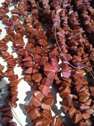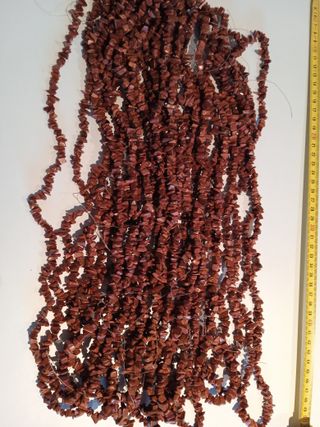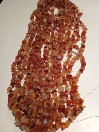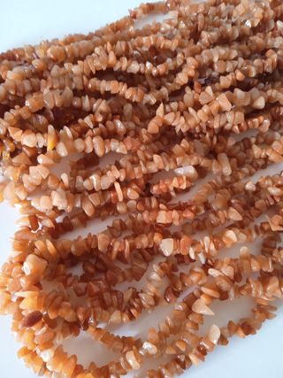 15 tiras de chips nuevas de carneola marron.De 85 cm Estas tiras de chips de piedra natural son perfectas para tus proyectos de bisutería o decoración. - Piedra natural en tonos marrones y anaranjados. - Chips irregulares de tamaño variado.