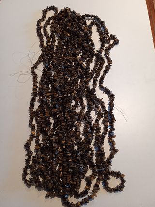 Se venden tiras de chips de piedra natural, ideales para bisutería y manualidades.9 tiras de ojo de tigre de 85 cm - Piedra: Ojo de tigre. - Forma irregular de chip. - Tonos marrones y dorados.