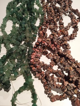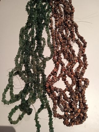 Conjunto de tiras de piedras naturales con un diseño irregular y moderno. - Piedras en forma de chips. - Ideal para bisutería y manualidades. 6 aventurina verde mas 4 jaspe de 85 cm