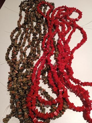 Conjunto de tiras de chips de piedra natural, perfectas para bisutería. - Piedras con forma irregular. - Variedad de tonos verdes y rojizos. 5 unakita mes 4 coral de 85 cm