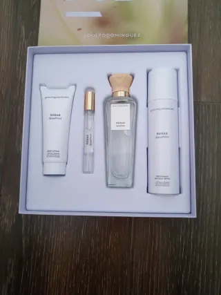 Estuche de Adolfo Domínguez con fragancia Rosas. - Loción corporal - Perfume en formato viaje - Eau de Toilette - Desodorante natural spray