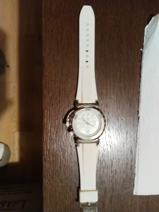 Reloj de pulsera con diseño moderno y elegante. - Correa de silicona blanca. - Bisel plateado con detalles. - Esfera blanca con indicadores.