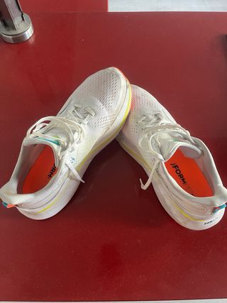 Zapatillas de running Saucony PWRRUN en color blanco con detalles naranjas y amarillos. - Parte superior de malla transpirable. - Suela con tecnología PWRRUN para una amortiguación reactiva. - Cierre de cordones. - Diseño deportivo y ligero.