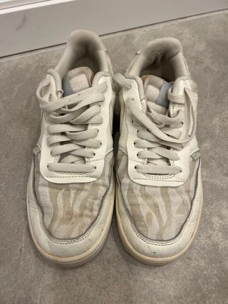 Zapatillas deportivas Nike con un diseño único. - Combinación de colores beige y blanco. - Estilo casual y moderno.