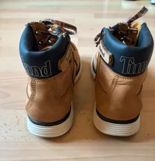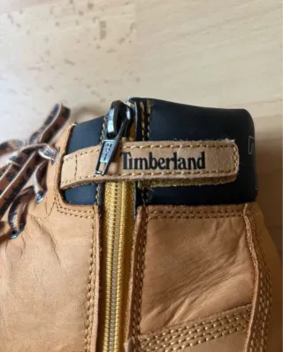 Botas Timberland de cuero en tonos beige y marrón. Cuentan con un diseño clásico y detalles de costura. - Cierre de cremallera lateral y velcro - Cordones con estampado. - Etiqueta con el logo de la marca. Hay discretos signos de uso, pero, usado un par de veces. Los zapatos de color clarito si manchan muy rápido, pero son muy bonitas, cómodas y suaves