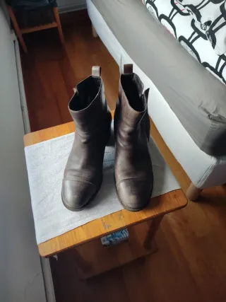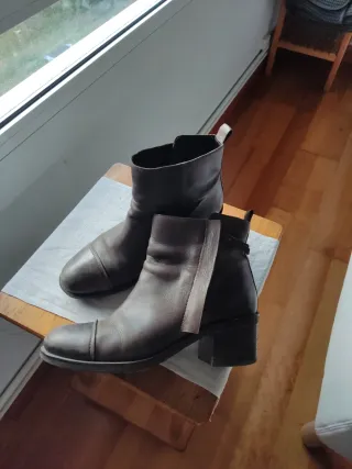 Botines de piel con un diseño moderno y elegante. - Material: Piel. - Color: Marrón. - Tacón cuadrado.