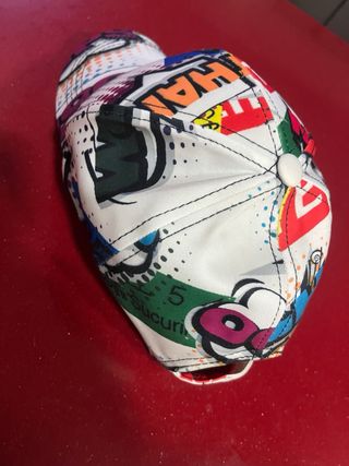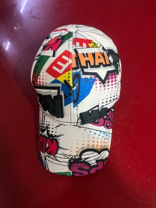 Gorra con un diseño vibrante y llamativo inspirado en el arte urbano. - Estampado de grafitis y onomatopeyas. - Base blanca con múltiples colores. - Estilo moderno y atrevido.