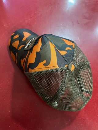 Gorra con diseño de camuflaje en tonos naranja y marrón. Cuenta con una malla en la parte trasera para mayor ventilación y un parche frontal con un paisaje de montaña y el texto WHAT I WANT IS SIMPLE. - Diseño de camuflaje. - Parche frontal temático.