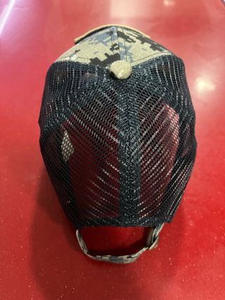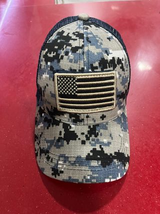 Gorra con diseño de camuflaje digital y parche de la bandera de Estados Unidos. - Estilo militar. - Malla transpirable en la parte trasera. - Visera curva.