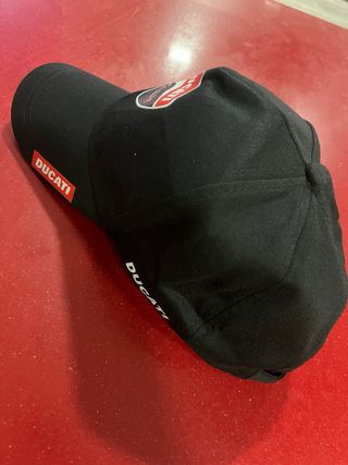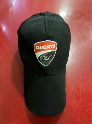 Gorra de béisbol negra con el logo de Ducati Corse. - Diseño frontal con el escudo de Ducati Corse. - Visera con costuras. - Etiqueta lateral roja.
