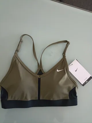 Sujetador deportivo Nike Indy en color verde oliva y negro. Diseñado para ofrecer comodidad y soporte. - Tirantes ajustables. - Diseño cruzado en la espalda. - Banda elástica inferior. Talla S