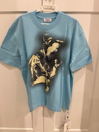 Camiseta de la marca Off-White con un diseño gráfico llamativo. - Color azul con estampado multicolor. - Talla S.
