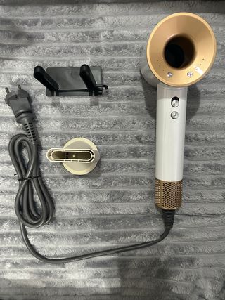 Secador de pelo profesional con múltiples accesorios. - Incluye soporte de pared. - Incluye accesorio concentrador. - Diseño elegante en blanco y dorado. - Con funcionalidad de aire frío y caliente