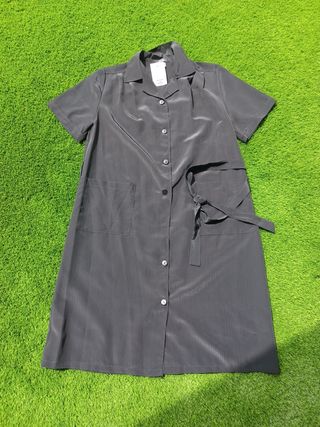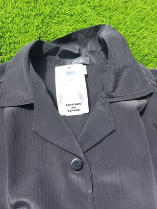 Precioso vestido negro de mujer, talla 48. Es de manga corta y tiene un diseño elegante y sencillo. Le falta un botón esta sin estrenar - Cierre de botones. - Dos bolsillos. - Fabricado en España. - Cinturón a juego.