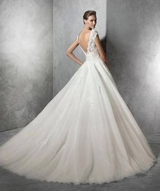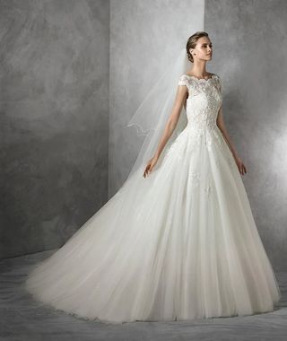 Precioso vestido de novia de PRONOVIAS, modelo Tamira. Es de color blanco roto y presente un diseño elegante y sofisticado con tul y encaje Chantilly, guipur, bordados de hilo y cuentas. Usado solo una vez. - Talla: (18) - Corte: evase - Escote: cuello barco - Espalda: con abertura