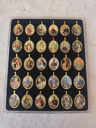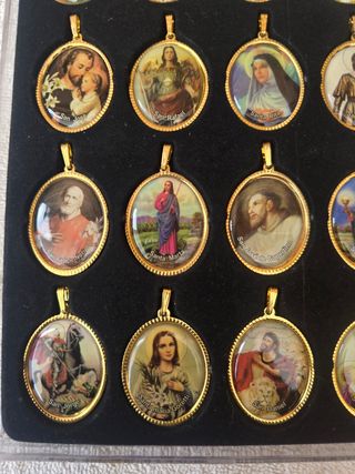 Preciosas medallas de santos, ideales para regalar o para uso personal. Se incluyen 30 medallas con imágenes de diferentes santos. Cada medalla tiene un diseño detallado y está en excelentes condiciones. - Medallas de metal dorado con detalles multicolor. - 30 medallas en total. - Perfectas para coleccionistas o devotos. Recogida en Arona, Tenerife sur.