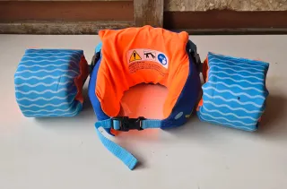 Chaleco flotador para niños, diseñado para ayudarles a sentirse seguros en el agua. Es cómodo y fácil de ajustar. - Diseño con olas en tonos azules y naranjas. - Cierre de seguridad con hebilla. - Material suave al tacto. En perfecto estado recogida en Arona, Tenerife sur