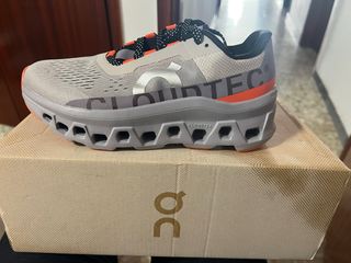 Zapatillas deportivas de la marca On Running. - Diseño en color gris con detalles en naranja. - Suela con tecnología Cloudtec.