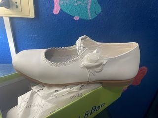 Elegantes zapatos para niña, perfectos para ocasiones especiales como la comunión. Se uso solo una vez. - Diseño clásico con tira. - Adorno de flor y perlas. - Borde festoneado. -Zapato de piel