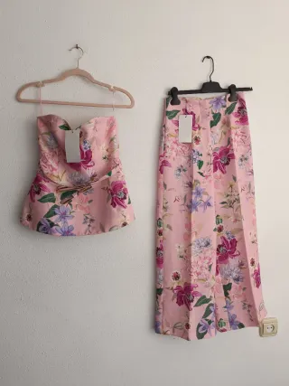 Conjunto traje de Zara estampado de flores con top y pantalón palazzo talla S Top estilo corpiño escote palabra de honor, hombros descubiertos, cierre con cremallera en la espalda. Detalle de cinturón a juego. Talla S Pantalón crop Palazzo de tiro alto, cierre con cremallera y botones. Talla S ideal para invitada evento ceremonia boda bautizo comunión graduación #invitadaperfecta #invitada #invitadaboda #invitadaideal #invitée #invitéemariage #inviteparfait #weddingdress #inviteeceremonie #invitadalowcost #invitadacone