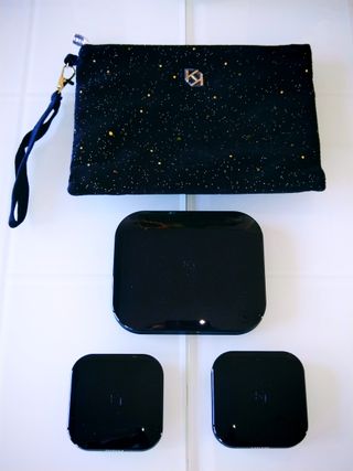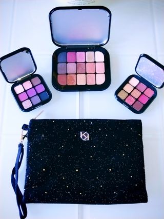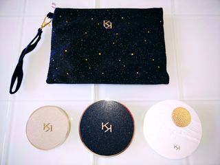 Conjunto de maquillaje Kiko Milano que incluye un iluminador, 2 paletas de sombras de ojos y un neceser - Neceser con diseño estrellado y detalles dorados. - Tres bases de maquillaje compactas con acabados brillantes. - Logo de la marca visible en cada producto. - Un iluminador - Dos paletas de sombras de ojos
