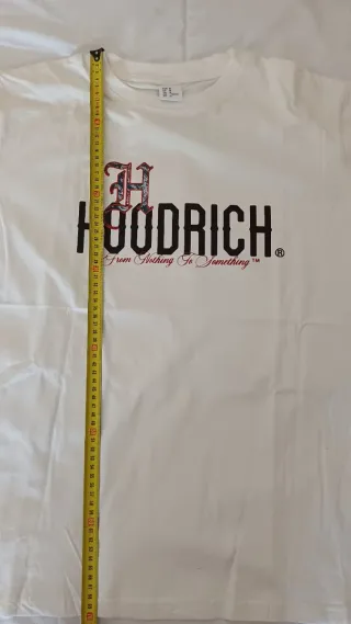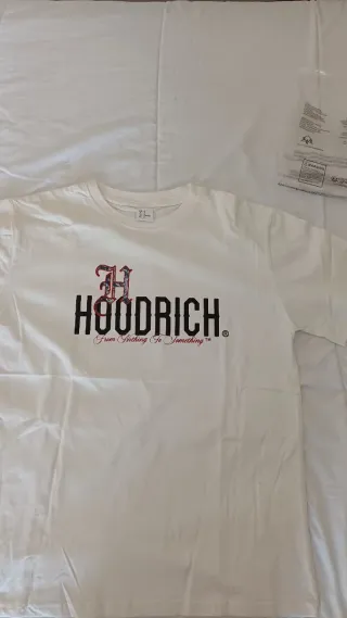 Camiseta de la marca Hoodrich en color blanco. Presenta un diseño gráfico distintivo en la parte frontal. - Estampado frontal con el logo 'H' y el texto 'HOODRICH'. - Inscripción inferior 'From Nothing To Something'. - Cuello redondo y manga corta.
