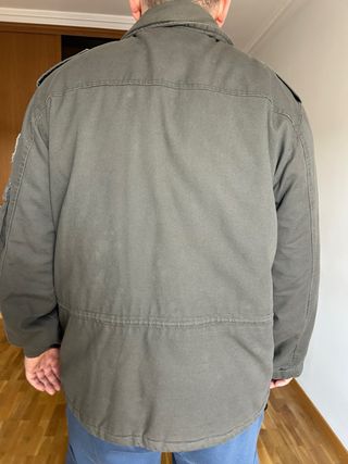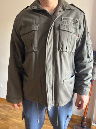 Abrigo estilo militar confeccionado en tela resistente. Un diseño clásico y funcional. - Color verde oliva. - Cierre de cremallera y botones. - Múltiples bolsillos frontales.