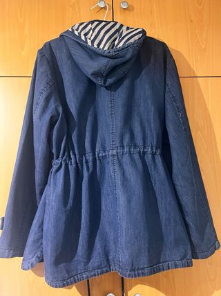 Chaqueta vaquera con un diseño moderno y detalles únicos. - Capucha con forro de rayas. - Cintura ajustable con cordón. - Bolsillos frontales con cremallera. - Puños con volantes.