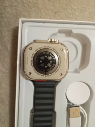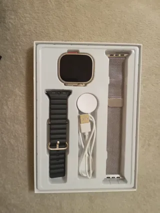 Conjunto de reloj inteligente con dos correas y cargador. - Pantalla con marco dorado. - Correa de silicona negra. - Correa de malla plateada. - Cargador inalámbrico USB.