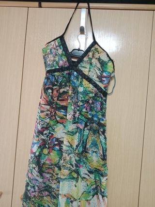Vestido largo muy bonito con estampado multicolor tipo artístico que lo hace muy llamativo y original. Atado al cuello (tipo halter) y con detalle de fruncido en los laterales, que estiliza la figura y crea un efecto muy favorecedor. Lleva lazo con goma verde brillante para ajustar y dar forma al vestido. Tejido ligero y con buena caída. No transparenta. Ideal para verano, vacaciones, eventos o cenas. Talla S. En buen estado.