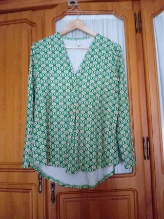 Camiseta de manga larga para mujer con un estampado geométrico llamativo. Poco uso. - Diseño con cuello en V. - Bajo curvo. - Tejido ligero y cómodo. No pone talla...pero es elástica, sirve para una xl o xxl